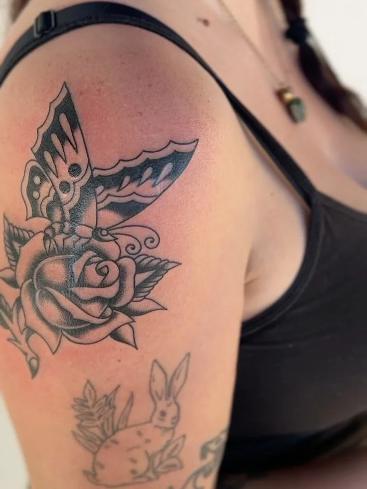 Drawing inspiration from the allure of the old west, the charm of vintage graphics, and the simple intricacies of Victorian era imagery, Birdie finds herself at home in the evocative and timeless legacy of traditional tattooing pioneers. Embracing all things reminiscent of a bygone era, Birdie infuses her work with a nostalgia, delivering an homage to the cherished traditions of yesteryear.